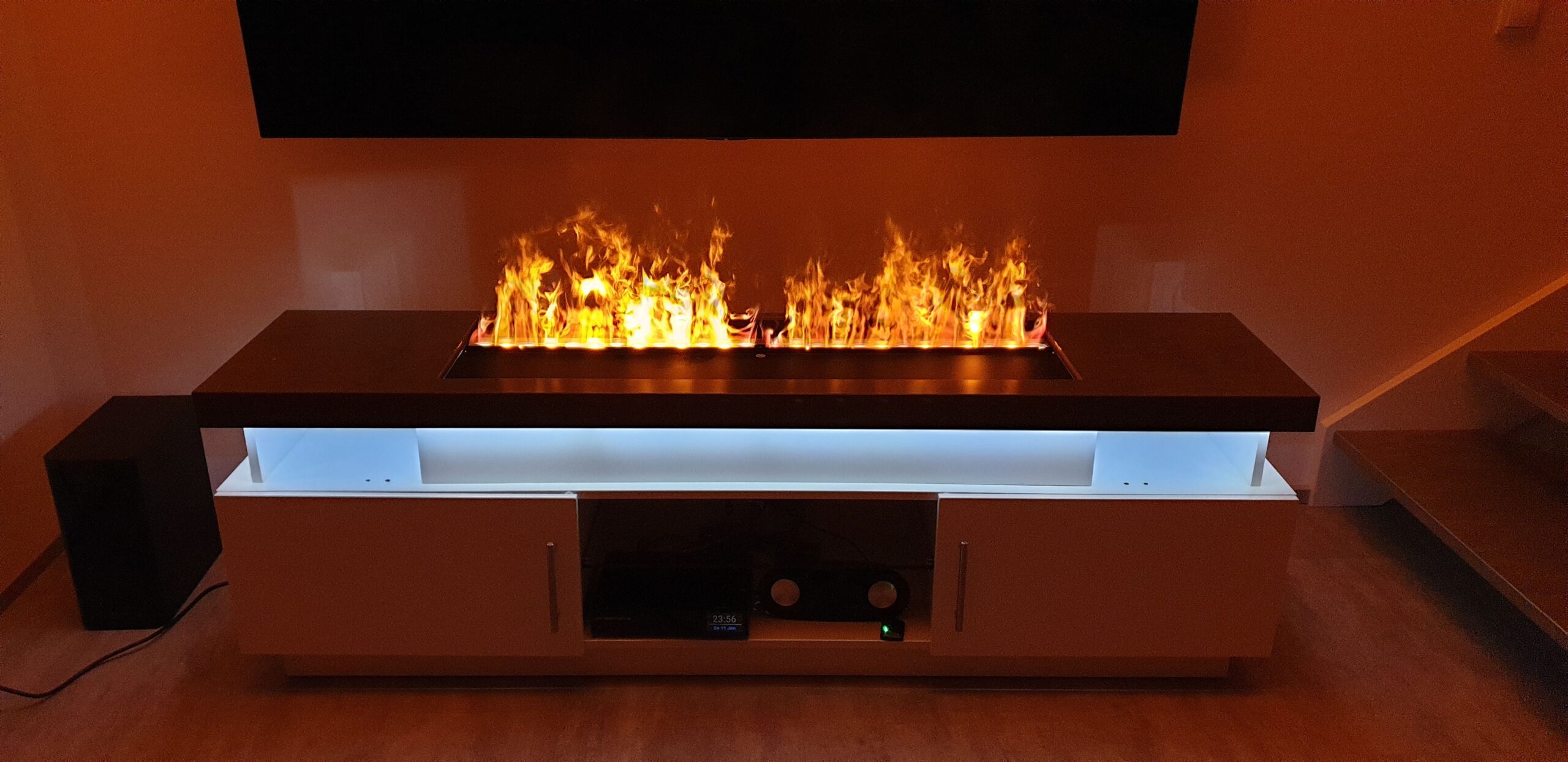 Bei diesem TV-Möbel mit integriertem Elektrokamin kann sowohl die Flammenfarbe als auch die Helligkeit der Flamme mit der Flame Connect-App perfekt eingestellt werden. Die Flammenfarben können in ziemlich jede Farbmischung umgewandelt werden. Stellen Sie sich vor, wie in Ihrem Wohnraum dreidimensionale Flammen tanzen. Mit der einzigartigen Kombination aus unserem patentierten Kaltwasserdampf und mehrfarbigen LED-Lichtern können Sie ein realistisches und sicheres Feuererlebnis genießen.